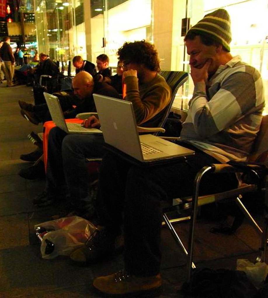 Cramer discusses the idea of how there seems to be the constant need to ‘upgrade’ our technology to the next innovation “from SD to HD and 4K, from DVD to BluRay, from 2D to 3D” – always marketed with a similar narrative of innovation, improvement, and higher fidelity of reproduction.” (Page 6). This idea attaches to the concept of product buyer/owner discussed in week 6 in Berger’s discussion of ‘Ways of Seeing’, with the constant influence of the product owner with the latest tech. This can be seen below in the ironic photograph, with people lined up using their apples products simply to buy more.